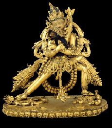 The deities on view in the exhibit represent various Buddhas. Two Vajradharas, in other words the first Buddha, are represented here, each signifying the unity of male and female. Part of the “revisionism” of tantric Buddhism allowed for a stronger role to be played by the female in the “story,” and in these Dorje Chang (in Tibetan), there is rampant symbolism indicating male aspects in the female, and vice versa. The sexuality of the two will be obvious.